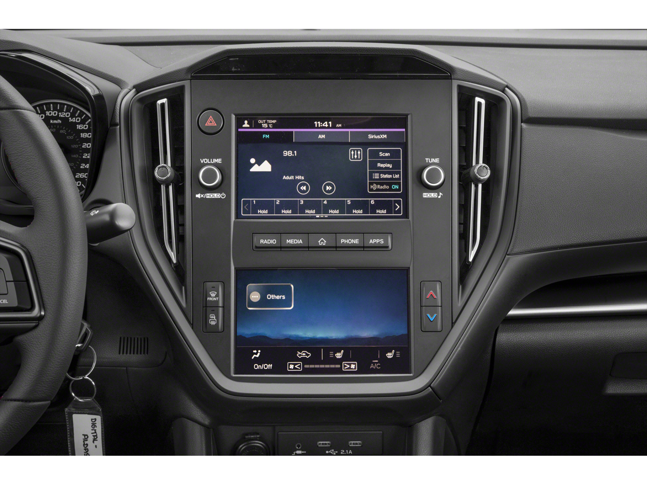 - Radio: Subaru STARLINK Dual 7" Multimedia Plus Sys -inc: AM/FM stereo HD Radio, multi-touch gesture high resolution display screen, voice activated controls, Bluetooth audio streaming connectivity, Bluetooth hands-free phone connectivity, Bluetooth hands-free SMS text messaging connectivity (applicable w/compatible cell phone), Near Field Communication (NFC), iPod control capability, rear-vision camera display, SiriusXM All Access radio (4 months free trial/subscription required after), SiriusXM Travel Link (4 months free trial/subscription required after), smartphone integration: Android Auto, Apple CarPlay, STARLINK cloud applications, 6 speakers and roof mounted audio and satellite antenna