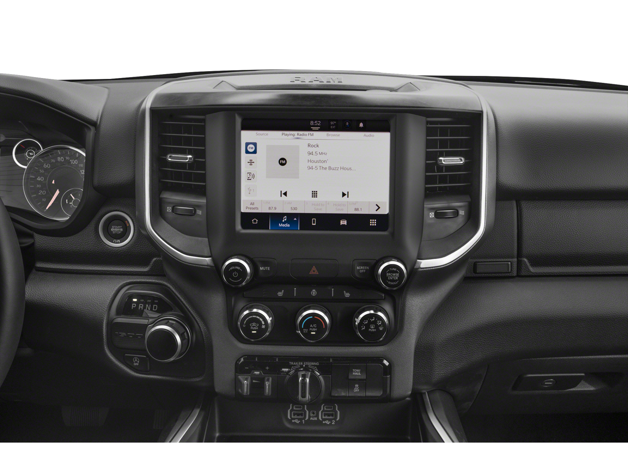 This model has a clean CARFAX vehicle history report. Apple CarPlay: Seamless smartphone integration for it - stay connected and entertained on the go! The installed navigation system will keep you on the right path. This Ram 1500 comes equipped with Android Auto for seamless smartphone integration on the road. The vehicle features a hands-free Bluetooth® phone system. Keep your hands warm all winter with a heated steering wheel in the vehicle . The Ram 1500 keeps you comfortable with Auto Climate. The leather seats in this model are a must for buyers looking for comfort, durability, and style. Protect this Ram 1500 from unwanted accidents with a cutting edge backup camera system. The vehicle's Forward Collision Warning feature alerts drivers to potential front-end collisions. The Ram 1500 has a V8, 5.7L high output engine. When you encounter slick or muddy roads, you can engage the four wheel drive on the Ram 1500 and drive with confidence.